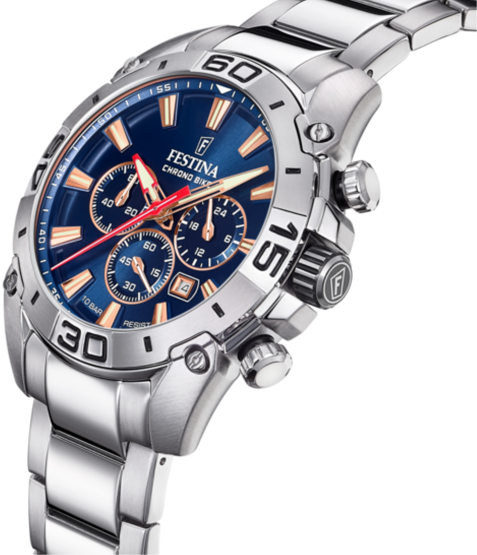Funkce:Čas, datum, chronograf = stopky, strojek quartz Japan Miyota (přesnos tchodu 0 - 0,5 vteřiny denně), v ručičkách je nanesena luminiscenční vrstva pro jasný pohled na čas ve tmě (Luminiscence svítí - po nasvícení si drží nějaký čas světlo)